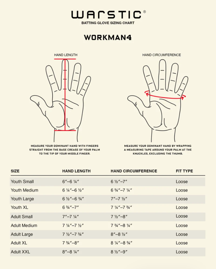 The Warstic® Workman4 Batting Gloves are the most durable gloves in baseball, now redesigned for a more advanced look and a fit that conforms naturally to your hand. Built with improved comfort, greater flexibility, and enhanced grip, they perform in all conditions and set a new standard for what a batting glove should be.